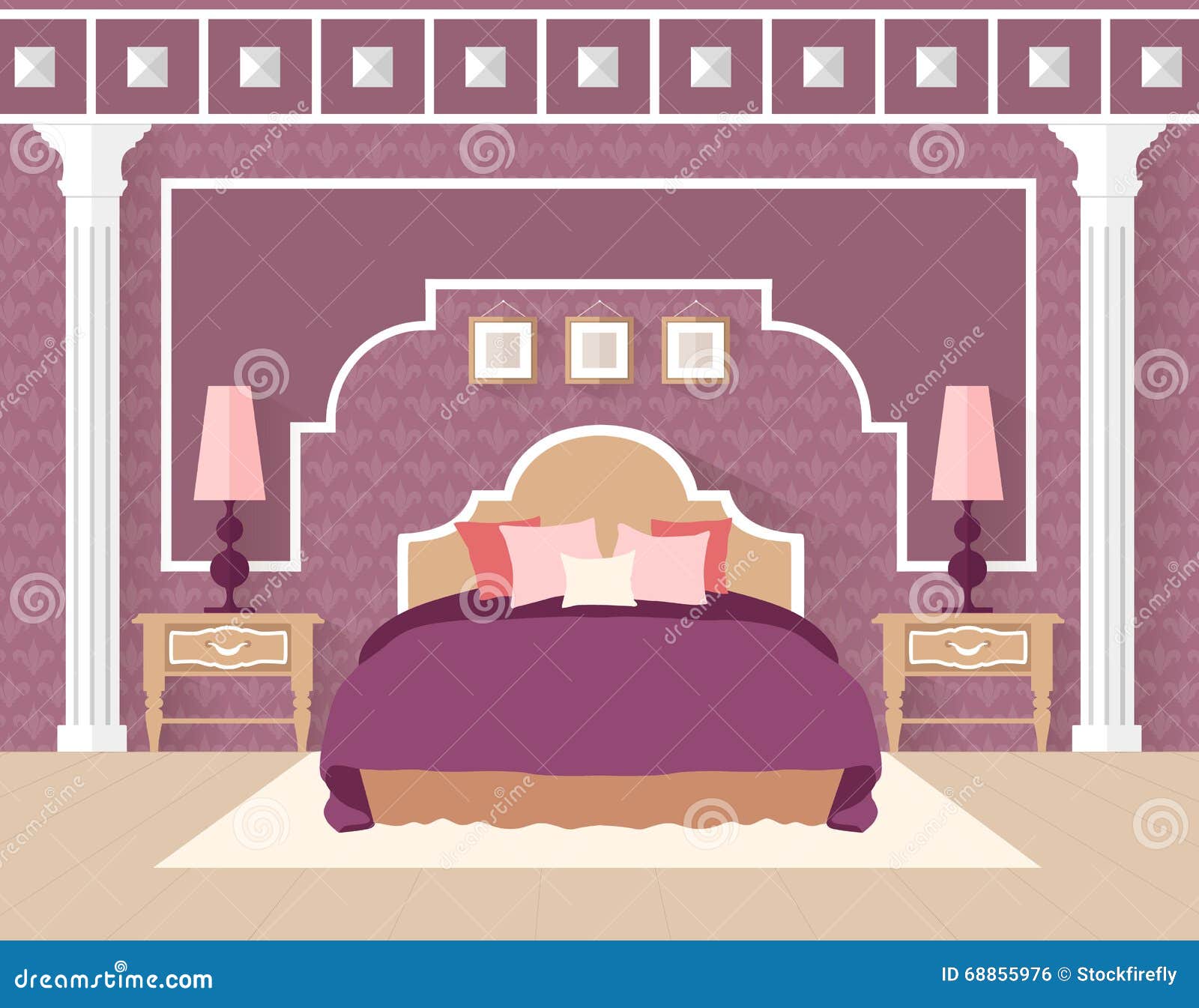 Vetores De Quarto De Hotel Com Cama Em Ilustracao De Cor Roxa E