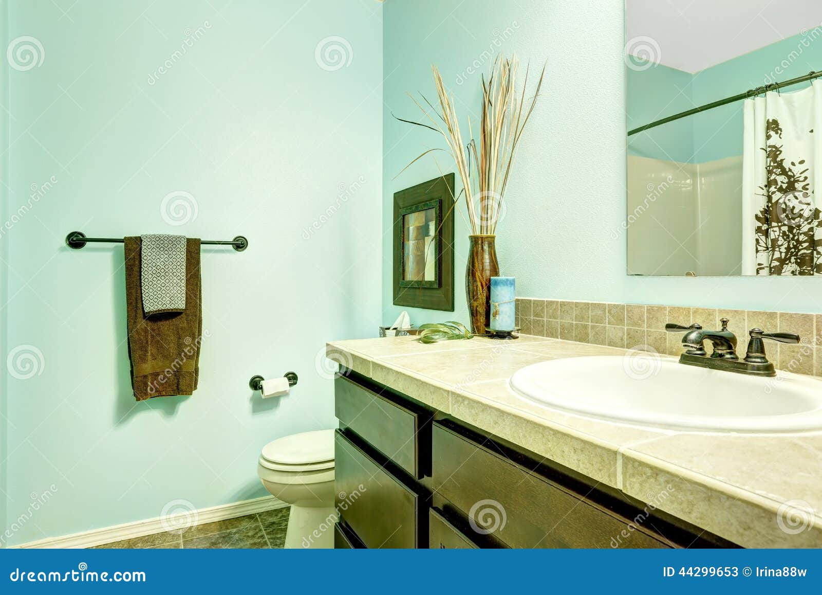 Foto De Marrom Banheiro Com Piso De Lajota E Paredes Azulclaro E