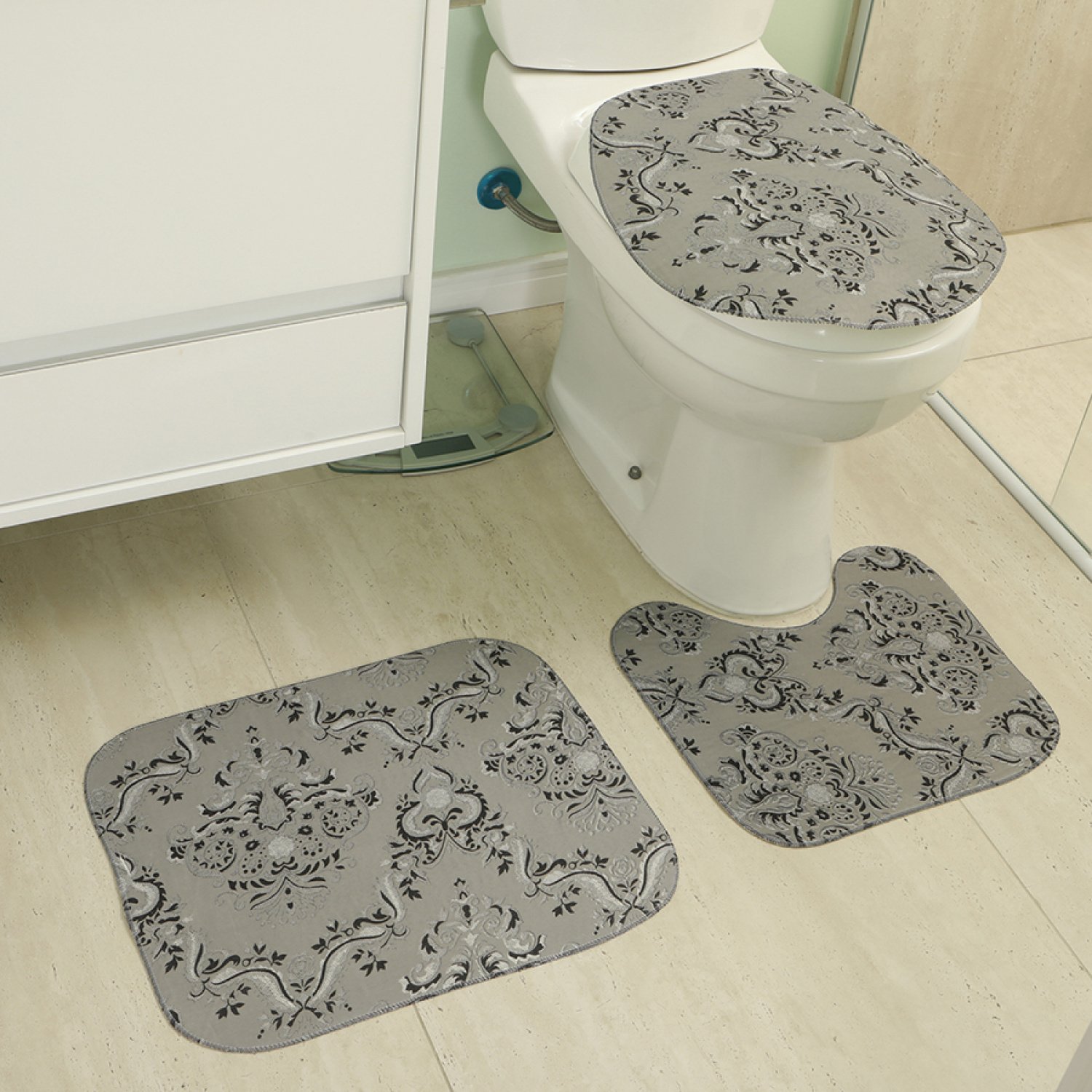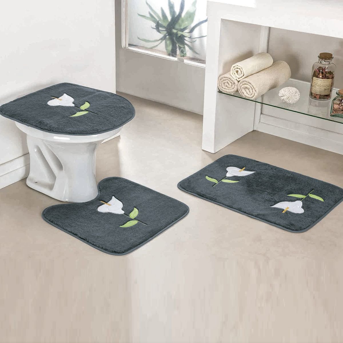 Jogo De Banheiro Creative 3 Pecas Antiderrapante Flor Cinza Colombo