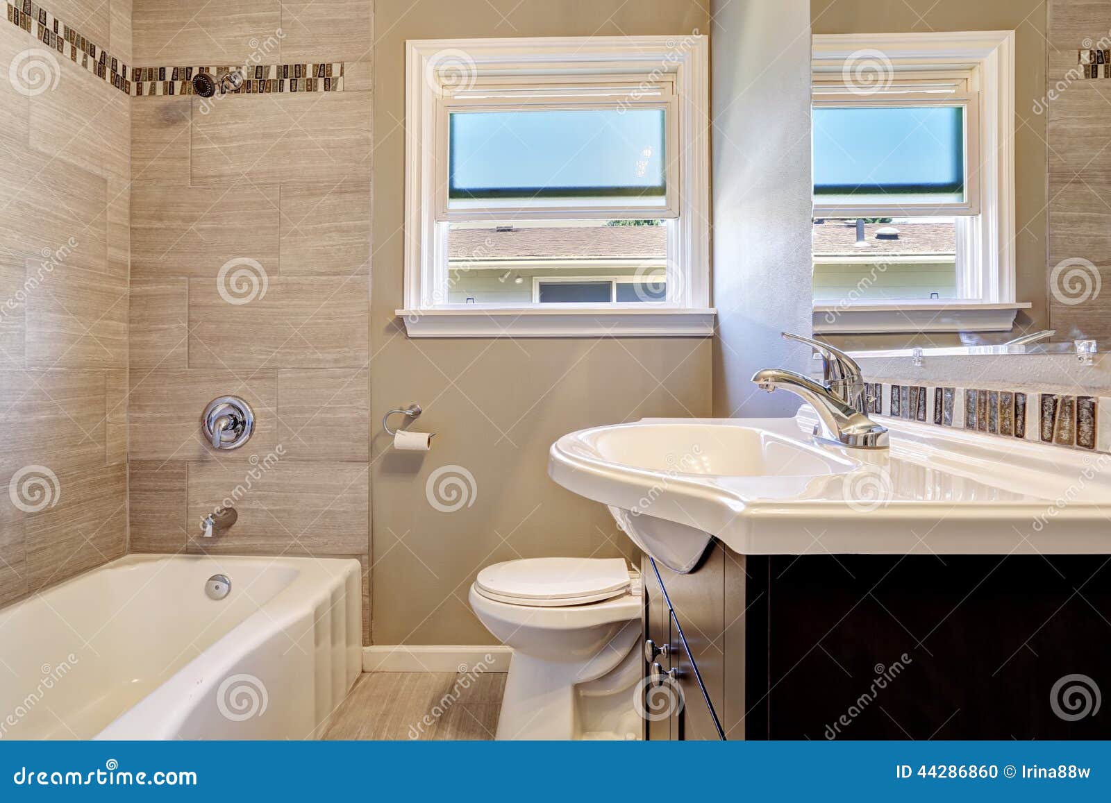 Empty Bathroom Interior With Tile Wall Trim In Soft Beige Color