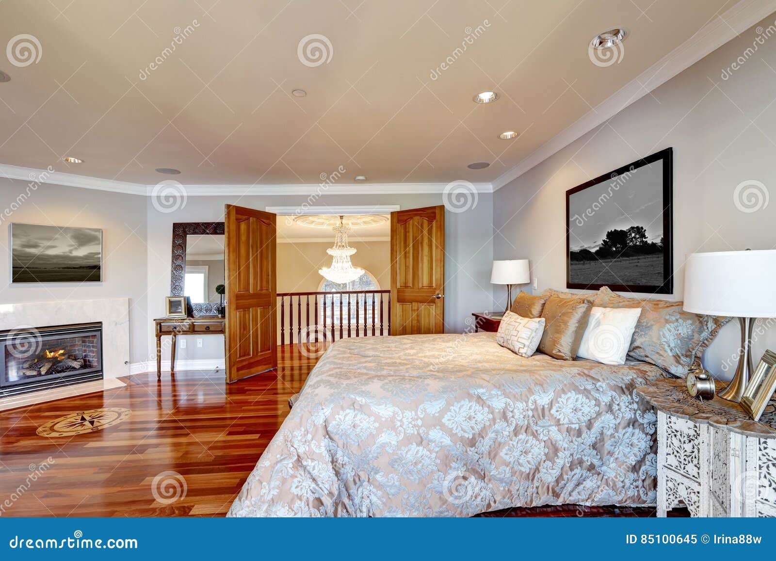 Interior Chique Do Quarto Principal Com Chamine Imagem De Stock