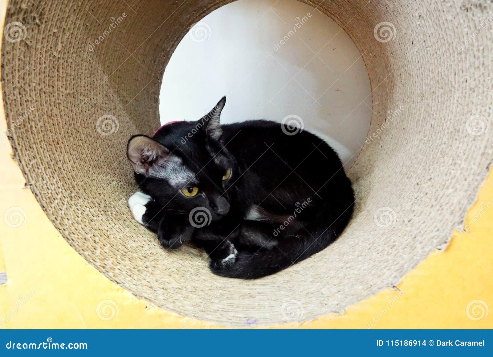 Gato Preto Que Dorme Na Caixa Mitted Foto De Stock Imagem De