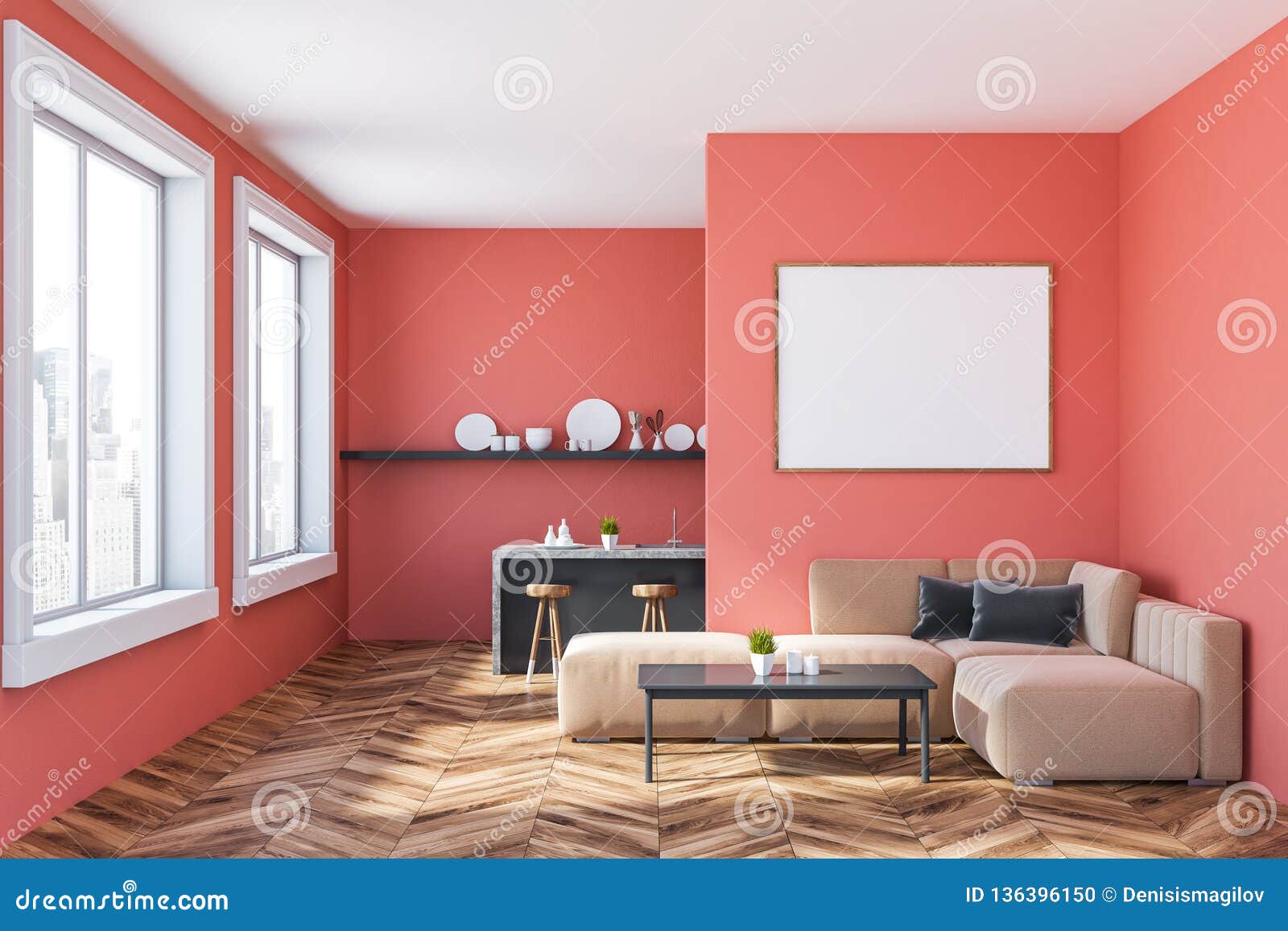 Cozinha Cor De Rosa Com Barra E Sofa Cartaz Ilustracao Stock